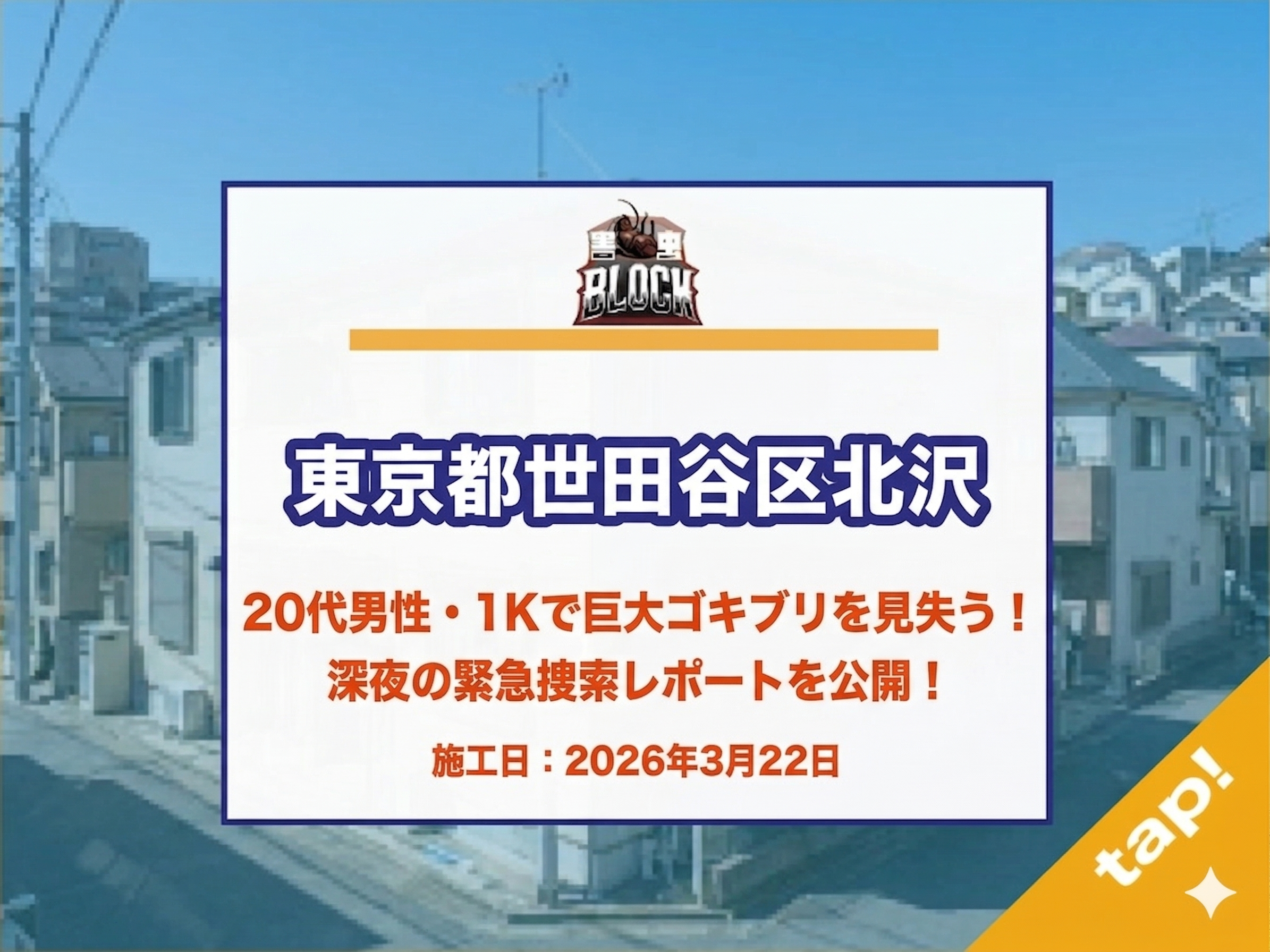 本日は、東京都世田谷区北沢にお住まいの20代男性(H.T様)よりいただいた、深夜のゴキブリ緊急捜索・駆除と、1Kのお部屋に特化した再発防止対策の施工事例をご紹介します。(施工日:2026年3月22日)/